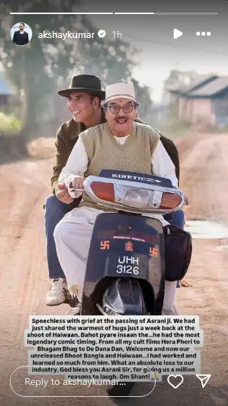 इस दुखद खबर के बाद अभिनेता Akshay Kumar ने सोशल मीडिया पर एक भावुक पोस्ट साझा की। उन्होंने लिखा कि उन्होंने Asrani जी के साथ कई फिल्मों में काम किया है और उनके साथ बिताए पल बेहद यादगार रहे। Akshay Kumar ने साथ ही यह भी साझा किया कि Asrani जी की कुछ आने वाली फिल्में थीं, जिनमें ‘Haiwan’ और ‘Bhoot Bangla’ शामिल हैं।