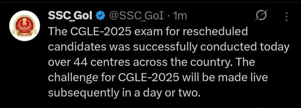 Staff Selection Commission (SSC) ने Combined Graduate Level (CGL) Examination 2025 का Tier 1 परीक्षा सफलतापूर्वक आयोजित कर लिया है। यह परीक्षा 12 से 26 सितंबर 2025 तक हुई थी, और इसके री-एग्जाम की तिथि 14 अक्टूबर 2025 थी। अब लाखों उम्मीदवार SSC CGL Answer Key 2025 का इंतजार कर रहे हैं। आधिकारिक उत्तर पत्र और प्रश्नपत्र 15 अक्टूबर 2025 को SSC की वेबसाइट ssc.gov.in पर उपलब्ध होंगे।